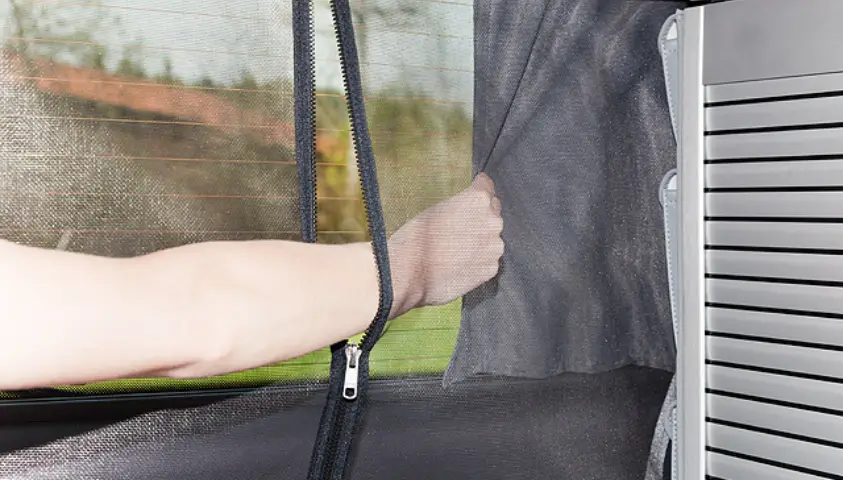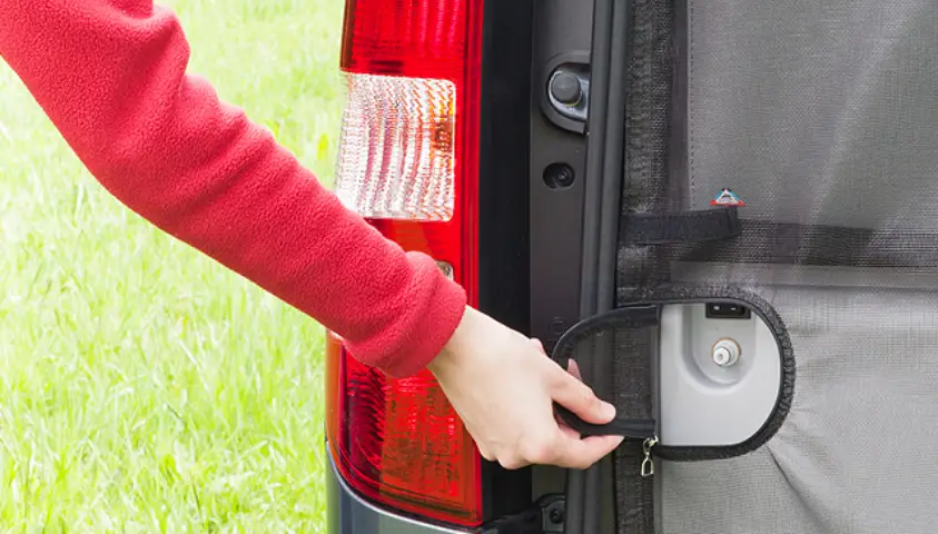 De FLYOUT muggennetten voor de achterklepopening hebben een rits met twee schuiven. Daarom kan het rolgordijn in het interieur van het voertuig eenvoudig worden gebruikt – het net hoeft niet volledig te worden geopend.